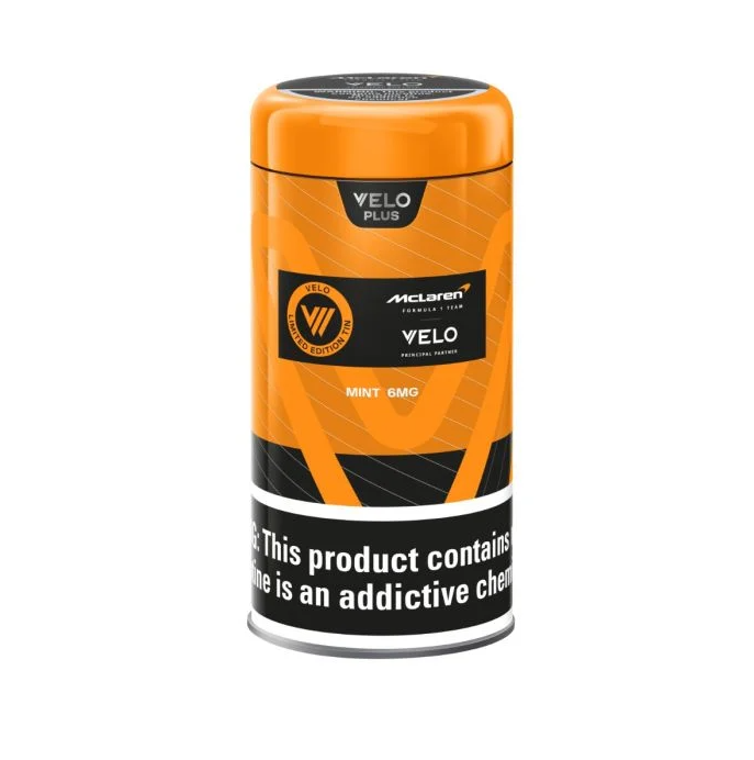 VELO Plus x McLaren Formula 1 Limited Edition Tin features 100 tobacco leaf-free pouches and a fresh, sweet, cooling mint flavor.